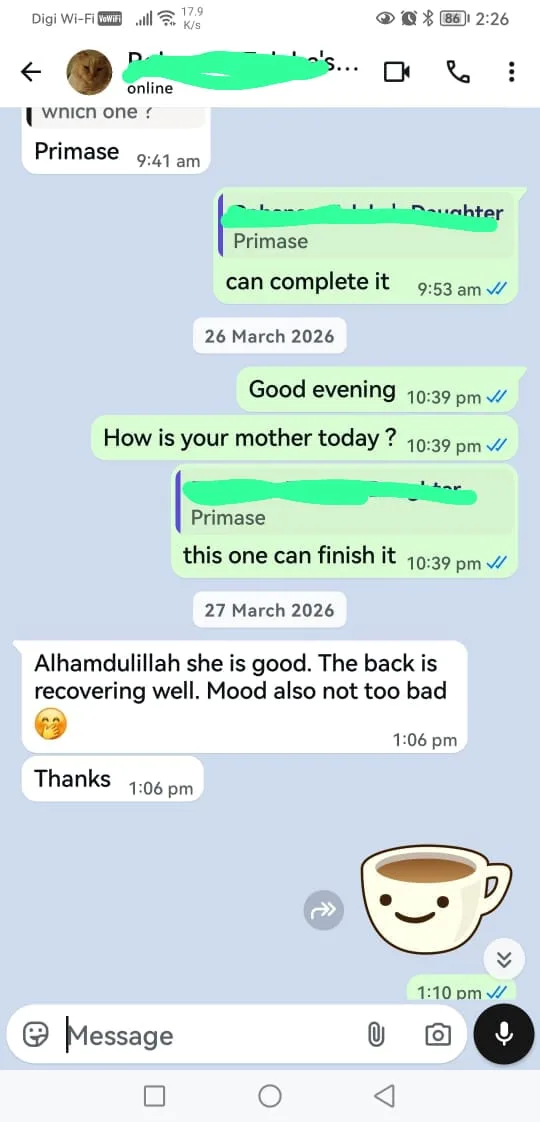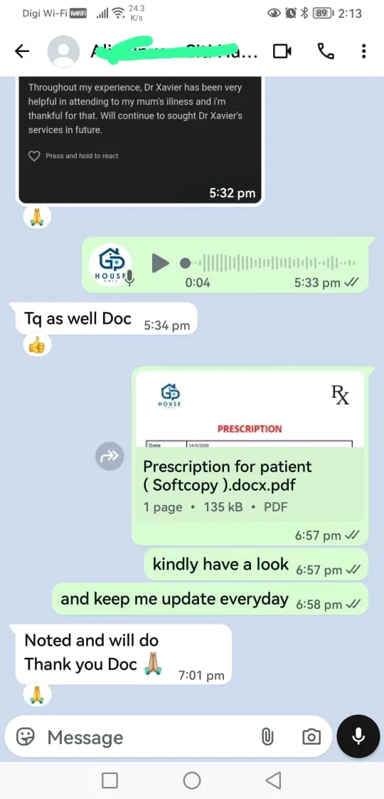 EXCELLENT Based on 159 reviews Posted on yap guanTrustindex verifies that the original source of the review is Google. Very good medication. Detail checking and Emergency action fast . The fees are reasonable.Posted on Jocelyn KwanTrustindex verifies that the original source of the review is Google. This is the second time we had Dr. Chong in our family when we need him and I highly recommended him to those who needed a home call doctor as he exhibited a very professional role to us. This could be seen during the times when my family member experienced some complications, his immediate reaction towards the treatment solution given and prompt reply whenever we got questions made the entire recovery process smoother and gave us a sense of strong confidence to go through this with him. Besides, his easy going and cheerful character and the consistent encouragement from him made us feel relieved as we know there is always someone to be there to encounter the situation with us whenever we need. so in conclude, we strongly recommend him to those who needed this service.Posted on Elynn TanTrustindex verifies that the original source of the review is Google. Dr Chong attended the query patiently & promptly, provided professional services and advices for my elderly grandmother. Would highly recommend to engage him if you need a house visit consultation, especially for elderly.Posted on Caroline VestergårdTrustindex verifies that the original source of the review is Google. Virkelig hurtig og god service til udskrivelse af medicin og recepter. Jeg havde det hele kort tid efter, at jeg havde skrevet til tjenesten :)Posted on CHAN VIVIENNETrustindex verifies that the original source of the review is Google. Very good service from Dr Xavier. He is caring and kind. Even post treatment service, call to check on my mum’s status. Appreciate all your assistance doctor!🙏🏻Posted on Corrinne LeeTrustindex verifies that the original source of the review is Google. Arranged a home visit for my father. Dr. Xavier arrived on time and carried out the consultation professionally. He was skilled at obtaining IV access, which can be challenging in for my father. Booking and communication was easy. Overall, a convenient and dependable home visit medical service.Posted on yap phei lingTrustindex verifies that the original source of the review is Google. The service here is fast and the doctor is very responsible. Everything was handled efficiently and with care. Highly recommended!Posted on Elanor 76Trustindex verifies that the original source of the review is Google. I’m lost for words to describe how good of a dr he is. Cares for the patient he visits and does his best to help. He follows up to see how the patient is doing which I’ve not had with some other house call Drs. He is also generous with his charges and is not calculative with it nor his time.Posted on Jaz TanTrustindex verifies that the original source of the review is Google. The service was excellent and very quick to understand my condition and provide the right treatment. Highly recommended.👍🏼👍🏼👍🏼Posted on IzzarosTrustindex verifies that the original source of the review is Google. Everything is good. Doctor Xavier fast respond. Highly recommended 👍🏻